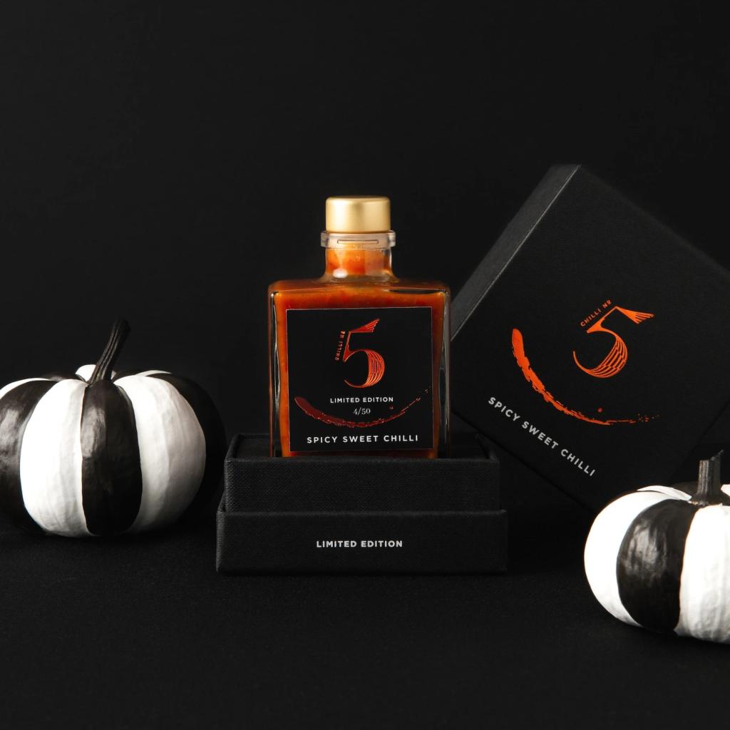 - Čierna darčeková krabička so štýlovým dizajnom a logom Chilli No5 robí z tejto omáčky krásny darček pre milovníkov ázijskej kuchyne.