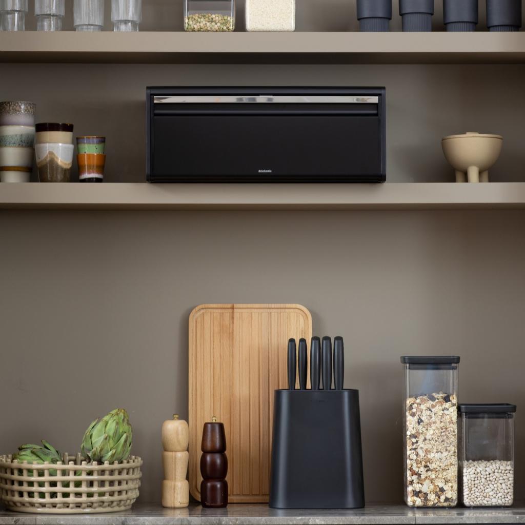 - praktický chlebník Brabantia FALL FRONT v elegantnej čiernej farbe je určený na skladovanie až dvoch bochníkov chleba bez zbytočného zaberania miesta
