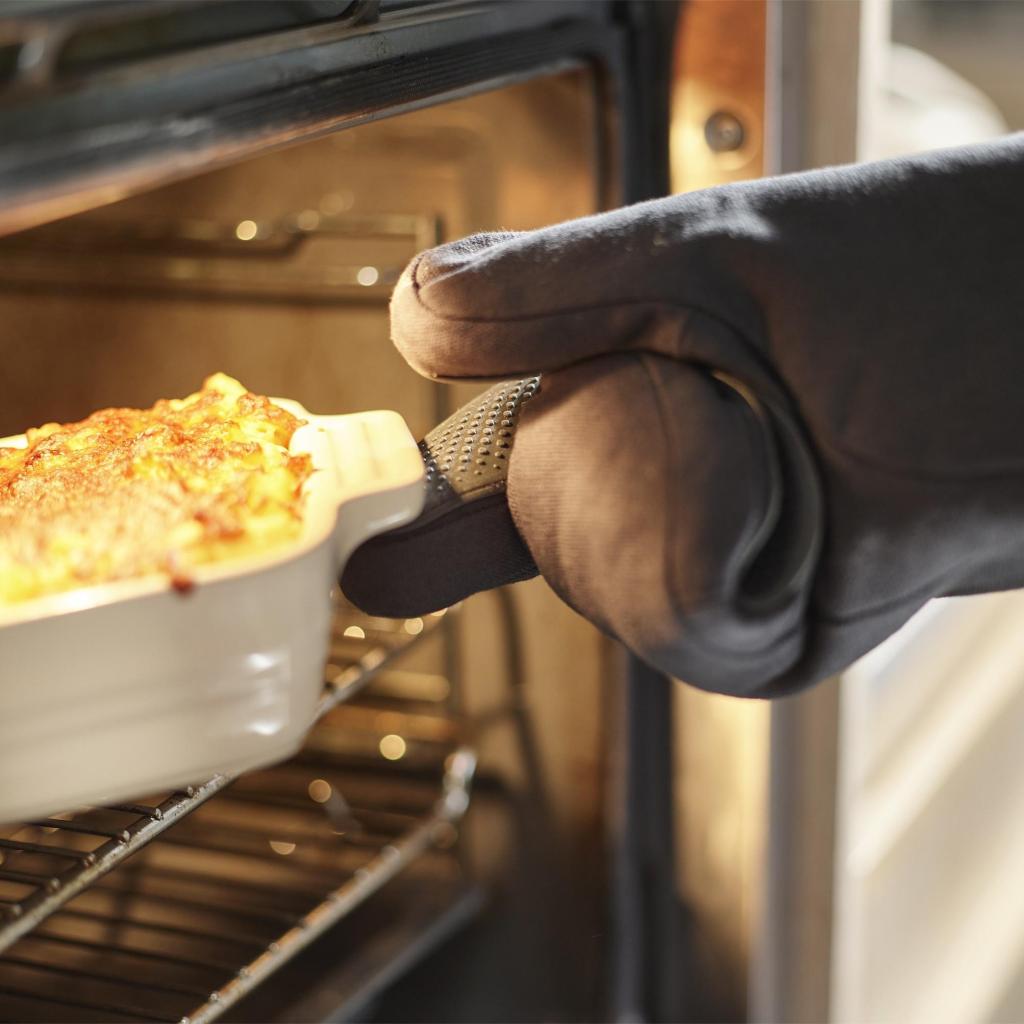 - Polstrovaná manžeta chráni nielen dlaň, ale aj zápästie pred sálajúcim teplom pri vyberaní rozpálených plechov z hlbšej rúry.