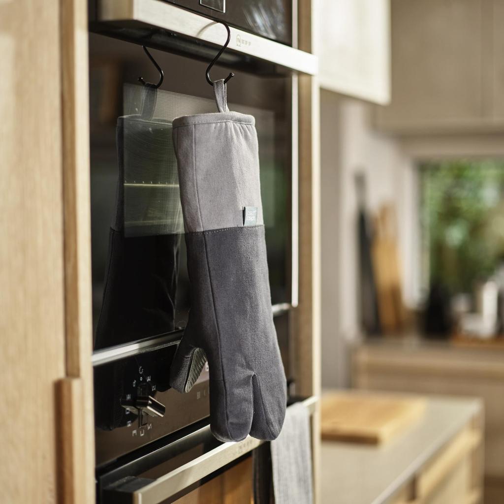 - Praktické pútko umožňuje jednoduché zavesenie na háčik alebo kuchynskú lištu, takže rukavica bude vždy po ruke a prehľadne uložená.