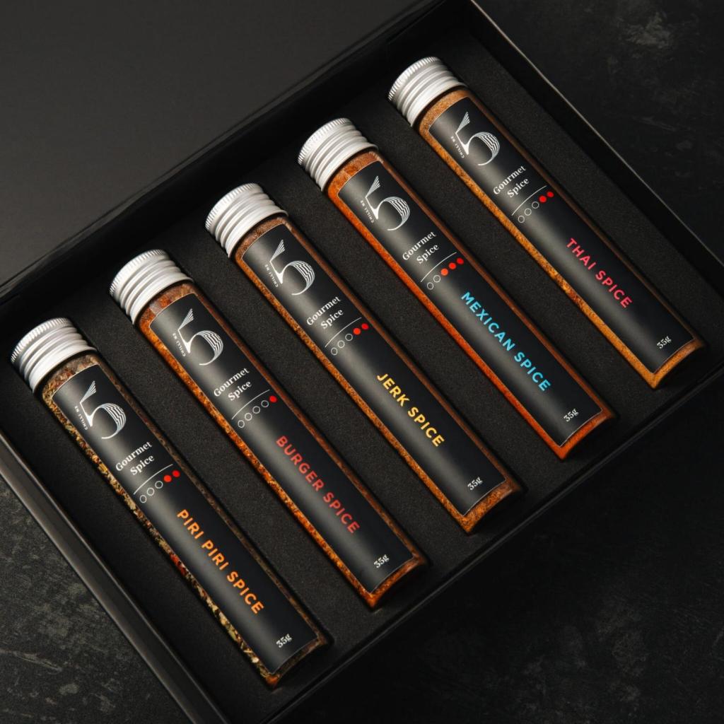 - Súprava obsahuje zmesi Jerk Spice, Burger Spice, Thai Spice, Piri Piri Spice a Tandoori Spice, takže si môžete vychutnať rôzne chute od dymových tónov po pikantné korenie.