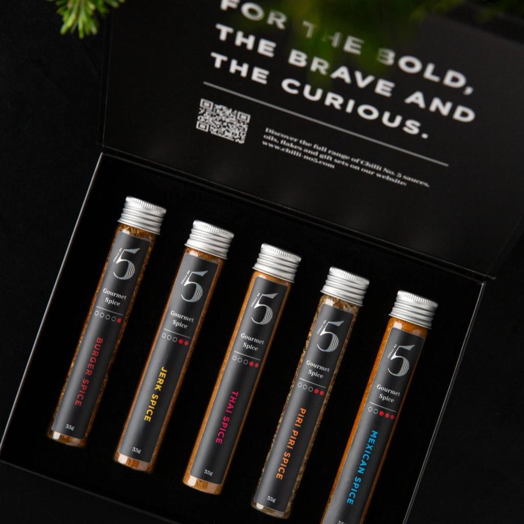- Darčeková sada SPICES, RUBS & SEASONING od Chilli No5 obsahuje päť druhov koreniacich zmesí s hmotnosťou 35 g, ktoré dodajú vašim pokrmom intenzívnu chuť a vôňu inšpirovanú kuchyňami celého sveta.