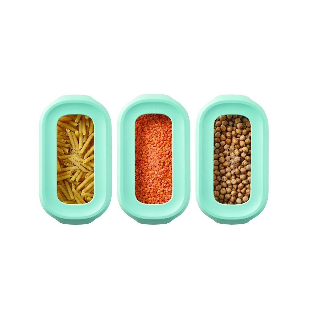 S inovatívnymi dózami na potraviny JOSEPH JOSEPH CupboardStore môžete využiť posledný voľný priestor pod policami kuchynskej linky. Sortiment CupboardStore zahŕňa napríklad túto sadu 3 ks 900 ml pohárov, ktoré sa zasúvajú do držiakov upevnených na spodnej časti police. Držiaky sú stabilizované silnou lepiacou páskou 3M. Poháre sú vzduchotesné, vhodné na skladovanie suchých potravín.