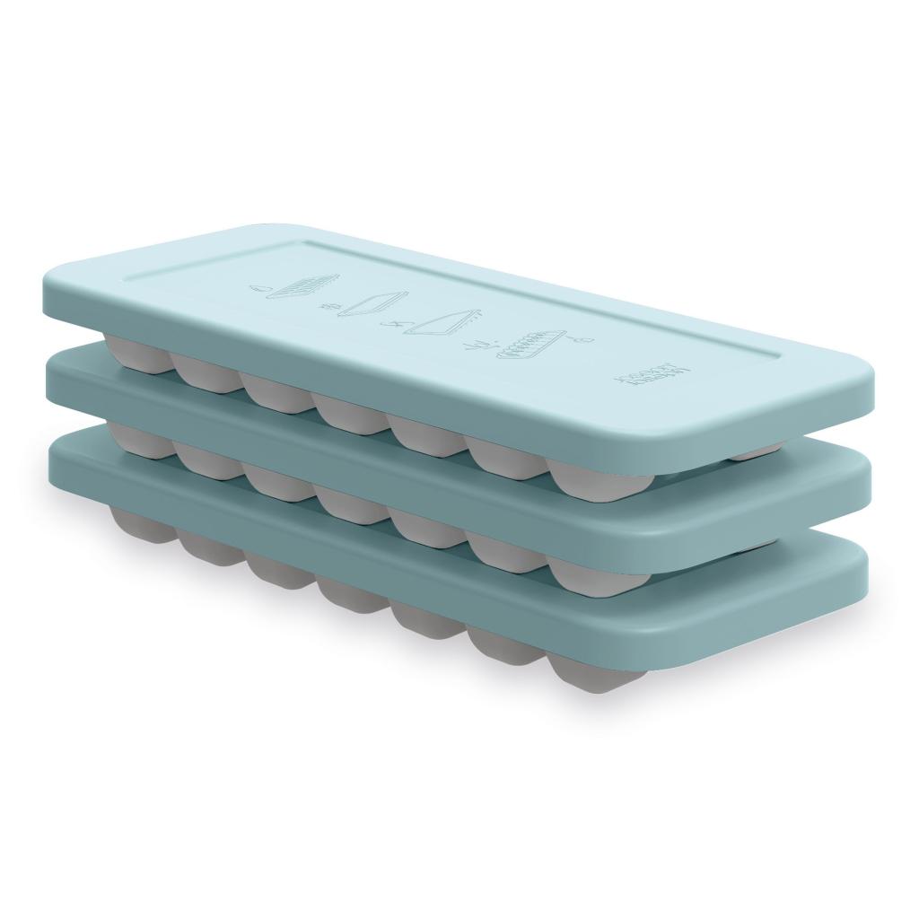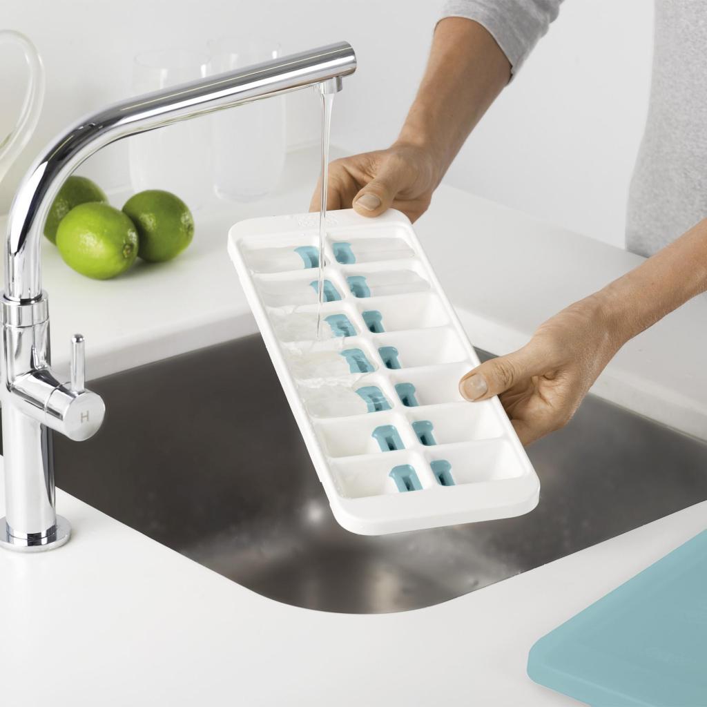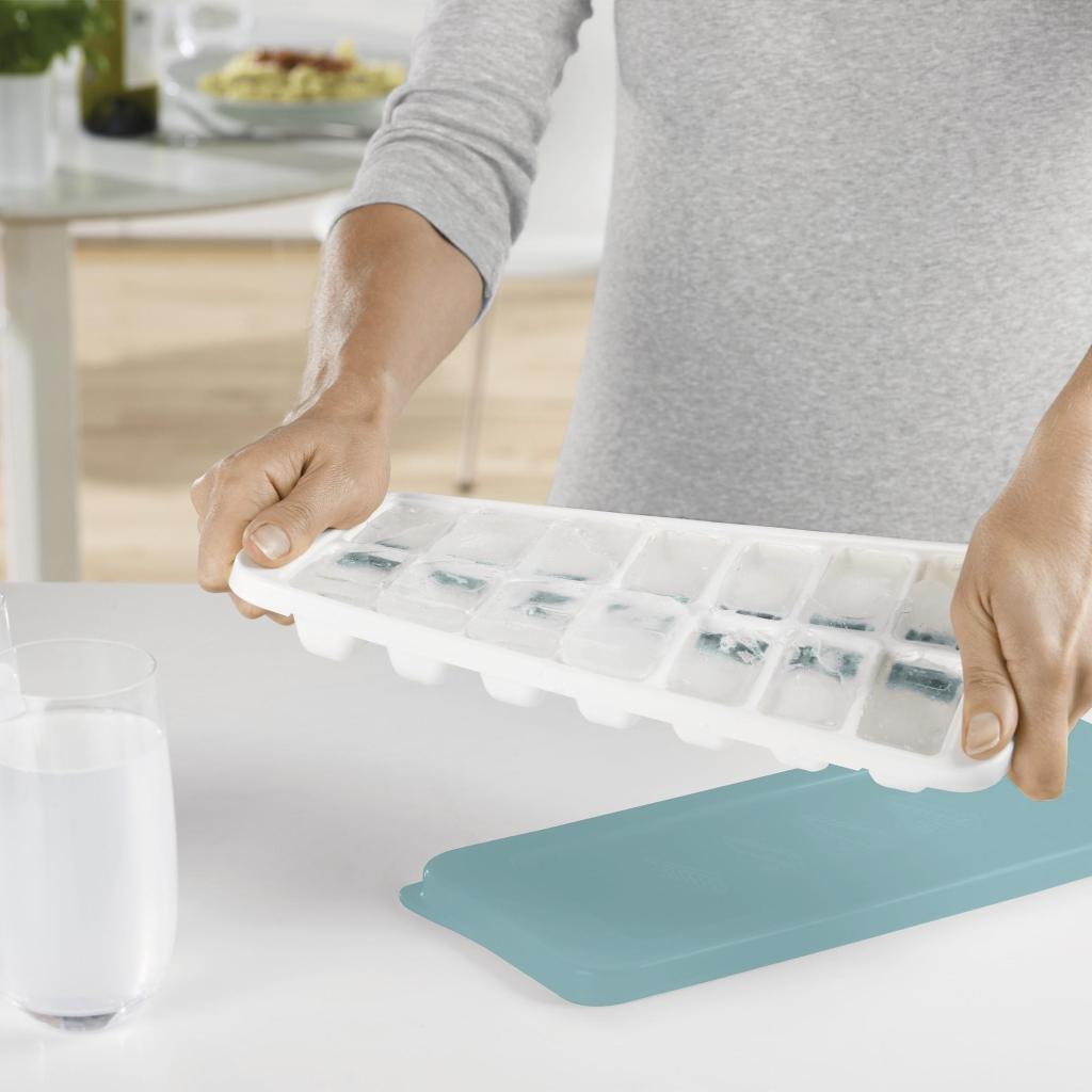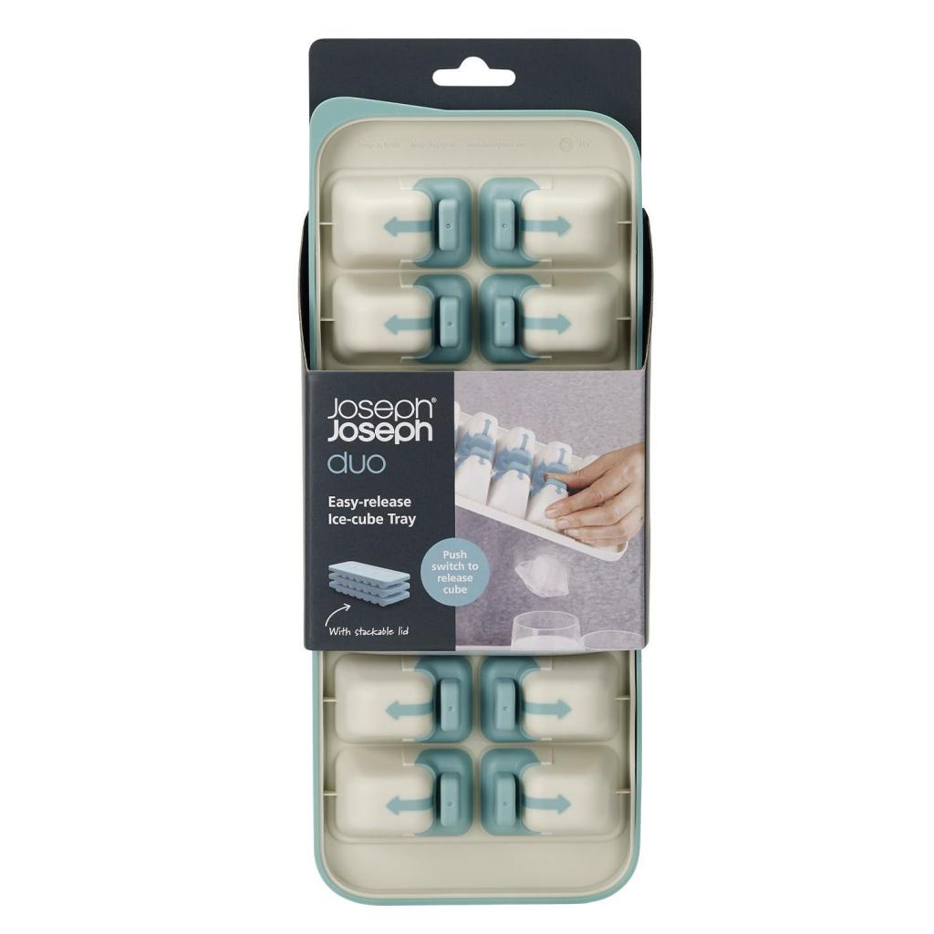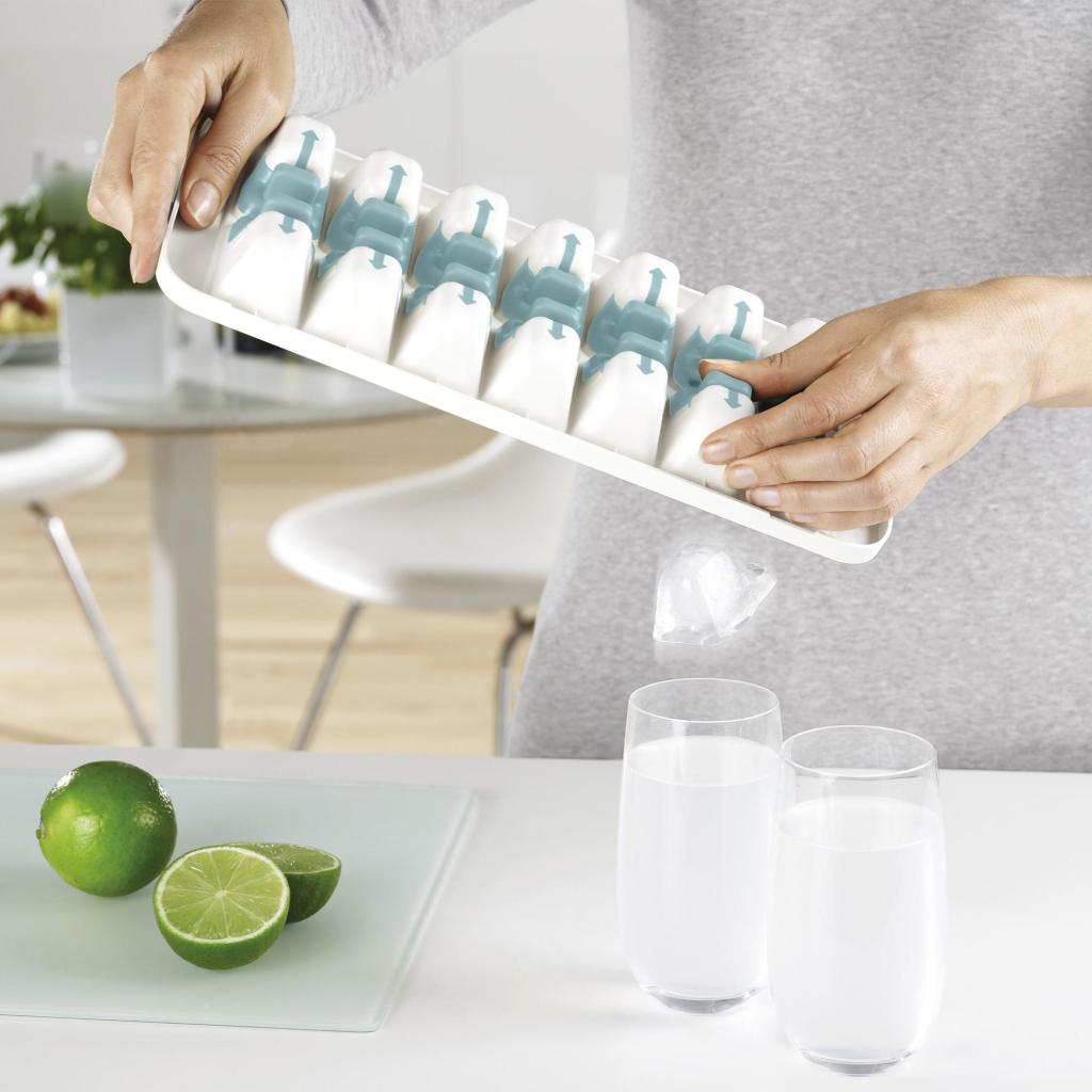 - Forma na výrobu kociek ľadu Joseph Joseph DUO využíva patentovaný mechanizmus pre jednoduché a kontrolované uvoľňovanie jednotlivých kociek bez nutnosti ich vysypávania naraz.