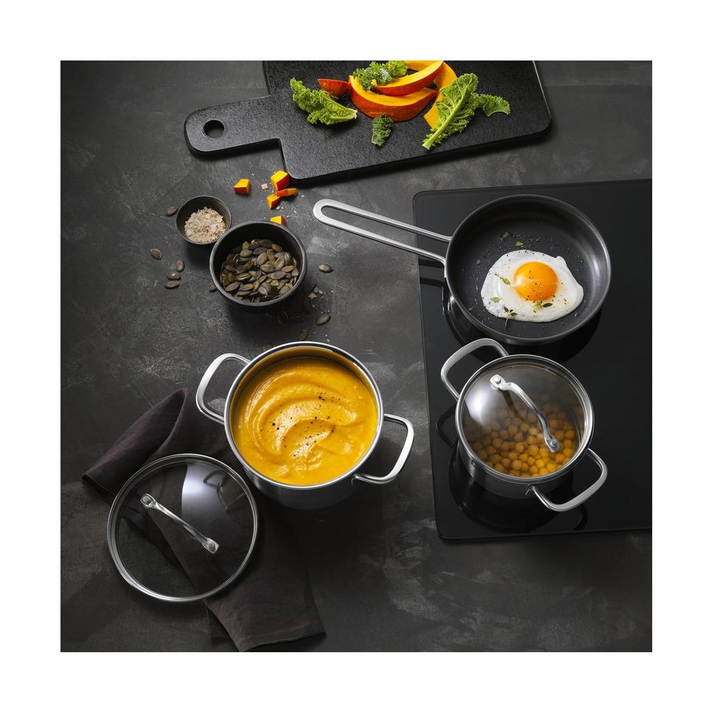 Hrniec s priemerom 14 cm a objemom 1,5 l je vyrobený z nerezovej ocele s hliníkovým jadrom. Saténovo hladký povrch odolný voči poškriabaniu pôsobí luxusne a nadčasovo. Je vhodný na všetky druhy varičov vrátane indukcie, do rúry do 200 °C aj do umývačky riadu.