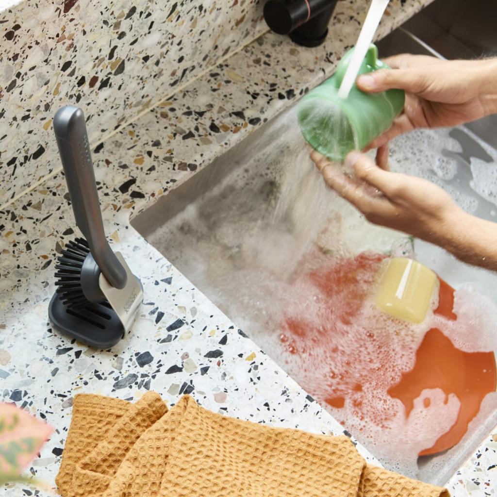 Riad sa sám neumyje, ale aspoň môže mať štýl. Kefa s vlastným stojanom pôsobí, akoby mala svoje pevné miesto v kuchynskej hierarchii, nie len tak ledabolo pohodená pri dreze. A vy máte konečne pocit, že aj umývanie riadu má systém, nie len mokrý chaos.