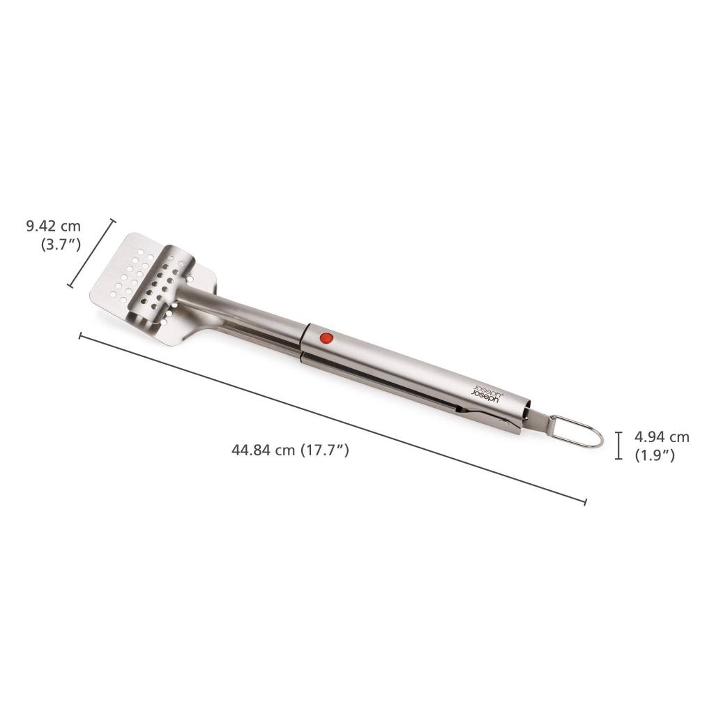 - Mechanizmus vysúvania je navrhnutý pre plynulé ovládanie, takže dĺžku nástroja možno ľahko prispôsobiť aktuálnej situácii pri grile.