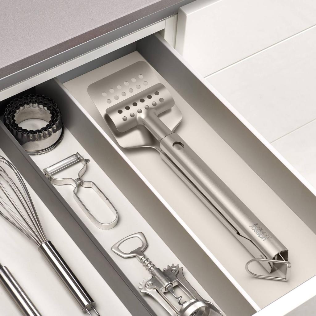 - Výsuvná hlavica sa dá zasunúť do rukoväte, takže náčinie zaberá minimum miesta pri skladovaní v zásuvke alebo preprave na záhradné oslavy.