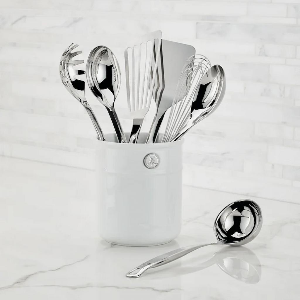 - V balení nájdete plnú lyžicu, perforovanú lyžicu, naberačku, lyžicu na špagety, plnú obracačku, obracačku na ryby, francúzsku metličku a extra veľký porcelánový stojan.