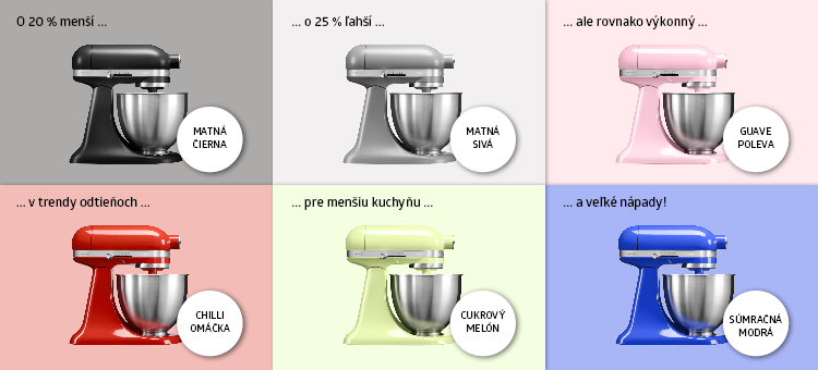 Nenechajte sa zmiasť o 20 % menšou veľkosťou oproti KitchenAid Classic Stand mixéru.Kuchynský robot Mini s legendárnou silou zvládne aj tie najnáročnejšie recepty! Nová veľkosť a nižšia cena pri zachovanej kvalite je ideálna pre menšiu domácnosť, alebo občasné pečenie (pre 2 – 4 osoby). Aj tak ale nejde o mini množstvo, v mise s objemom 3,3 l pripravíte až 60 cookies sušienok. K dispozícii v konzervatívnych aj odvážnych farbách.