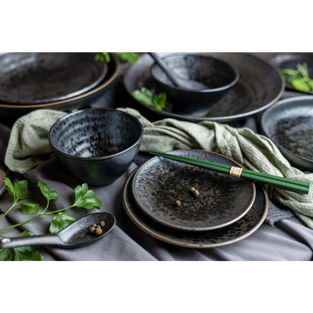 Kolekcia Black Pearl vyniká čierno - sivým prevedením, ktorý pripomína kovový efekt. Miska je vyrobená ručne z prírodnej keramiky - neobsahuje kovy ani škodlivé farbivá. Keramika je kvalitná, farby sú stále nemenné a neodlupujú sa. Každý kus je originál s tradíciou siahajúcou až do 12. storočia. Keramika je priamo dovezená z Japonska. 25 rokov sa riad MIJ využíva v reštauráciach a tak je ich kvalita a životnosť potvrdená. Je vhodná do umývačky riadu aj do mikrovlnej rúry. |