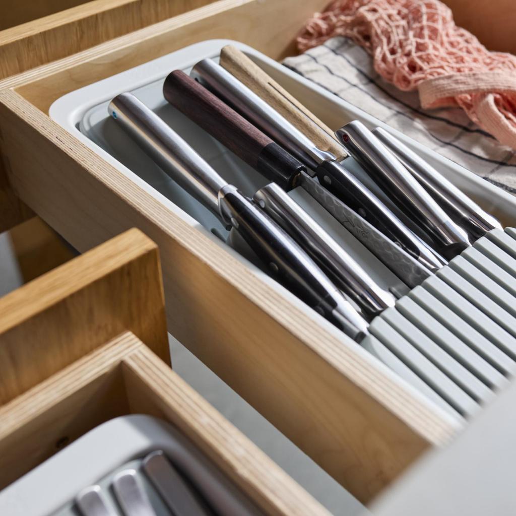 - Uloženie nožov v zásuvke pomáha udržať pracovnú dosku voľnú a kuchyňa pôsobí upratanejšie.