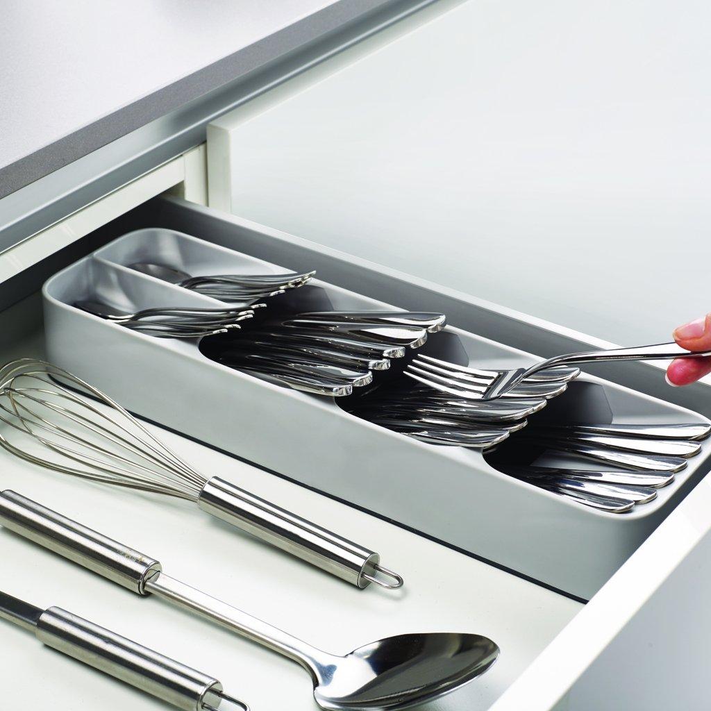 Ukladanie príborov pod uhlom nad sebou v zásuvke JOSEPH JOSEPH DrawerStore ušetrí viac ako polovicu priestoru zásuvky. Príbory môžete vkladať do označených otvorov na oboch stranách. Protišmykové nožičky zaisťujú stabilitu priehradiek. Organizér môžete použiť v zásuvke s minimálnou hĺbkou 8 cm.