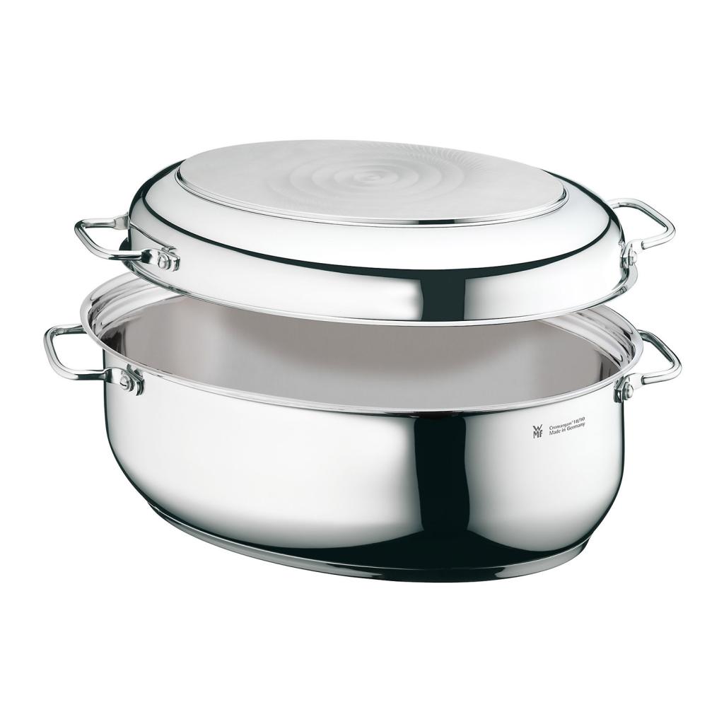 Oválny pekáč s pokrievkou, ktorá má dvojaké využitie, od tradičného nemeckého výrobcu WMF, je ideálny na varenie, smaženie, opekanie a dusenie mäsa, rýb a zeleniny. V objemnom pekáči jednoducho pripravíte lahodné pečené hovädzie mäso pre celú rodinu alebo celú pečenú hus so zlatistou kôrkou. Povrch bude dokonale chrumkavý, kým mäso vo vnútri zostane vláčne a šťavnaté. Pekáč sa skvele hodí na použitie v rúre. Multifunkčná pokrievka, ktorú je možné používať ako panvicu, oceníte pri restovaní na platni. Pekáč aj pokrievka sú vybavené univerzálnym dnom Trans Therm®.