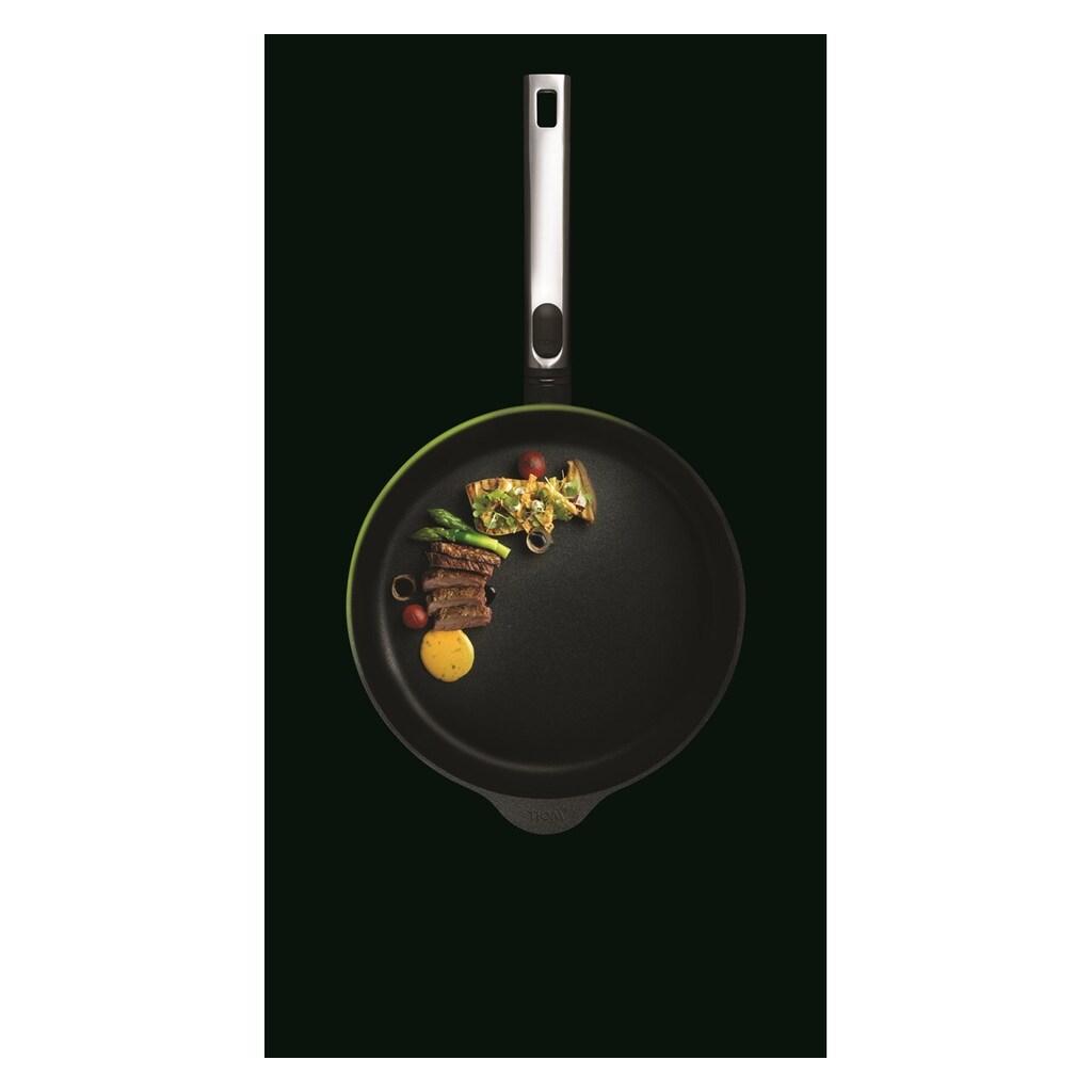 Tepelne odizolovaná ergonomická rukoväť z nehrdzavejúcej ocele nie je odnímateľná. 8 mm hrubé dno z feromagnetickej ocele je vyrobené špeciálne pre WOLL. Zosilnené okraje panvice zabezpečujú lepšiu odolnosť proti nárazom.