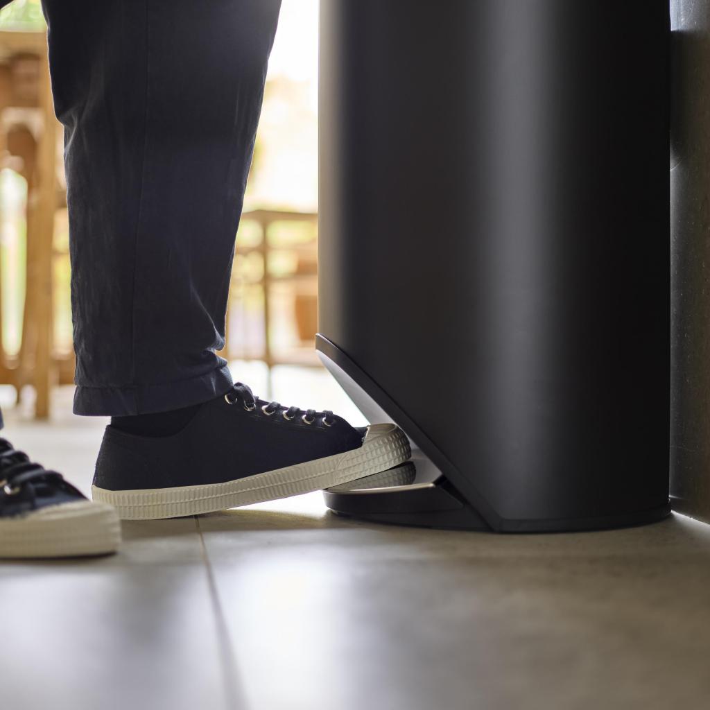 - Veľký a pohodlne ovládateľný pedál umožňuje otvorenie veka bez použitia rúk, čo výrazne uľahčuje manipuláciu s odpadom počas varenia alebo upratovania.