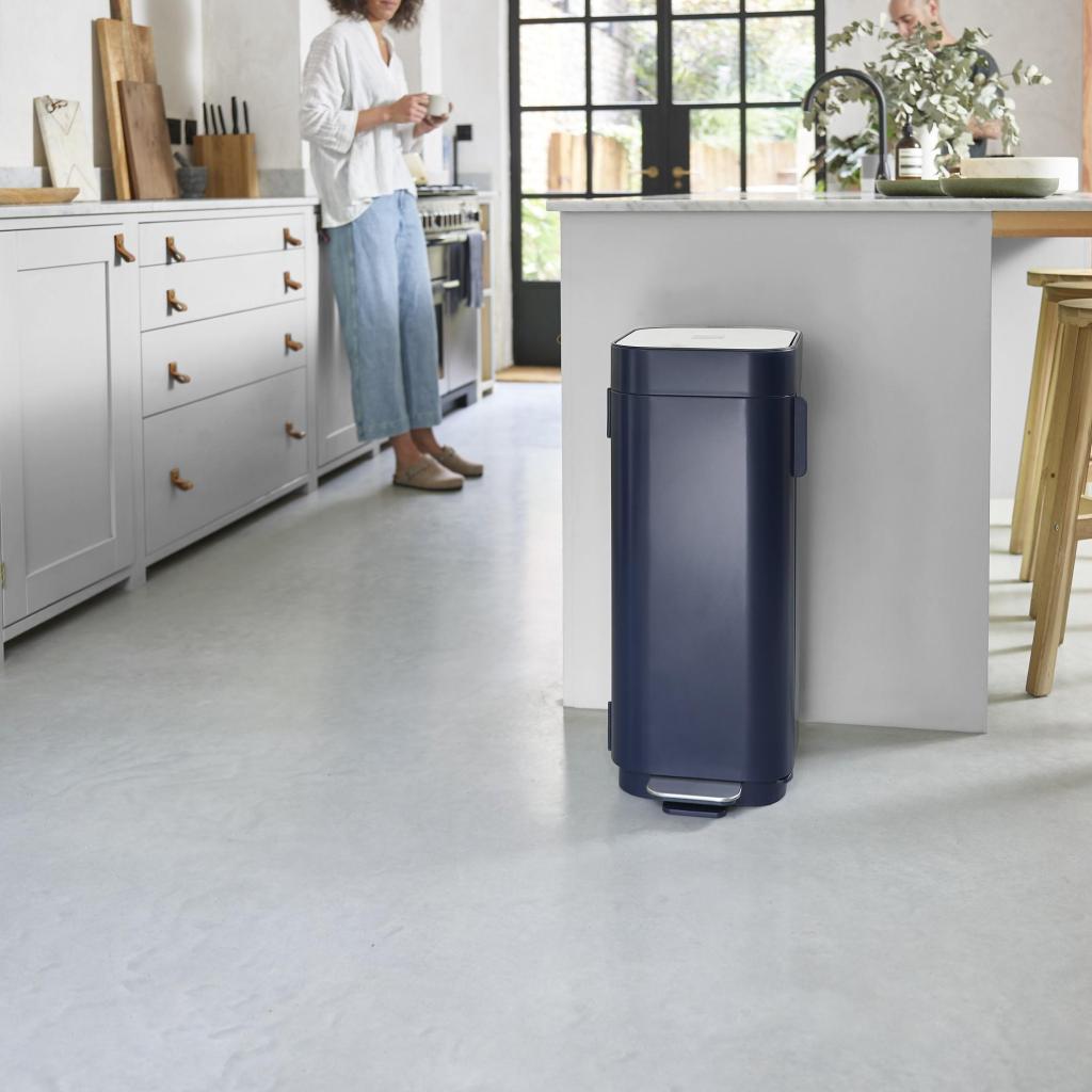 - Pedálový odpadkový kôš PORTA v modernom modrom prevedení ponúka praktické a hygienické riešenie pre každodennú manipuláciu s odpadom v kuchyni alebo domácnosti.