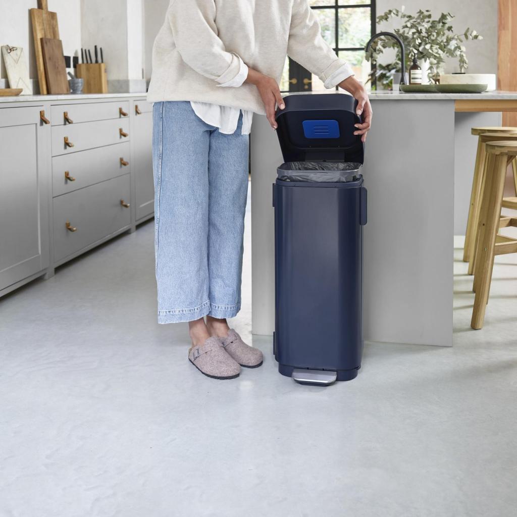- Pedálový mechanizmus umožňuje otvorenie veka bez použitia rúk, čo prispieva k hygienickejšiemu zaobchádzaniu s odpadom počas varenia alebo upratovania.