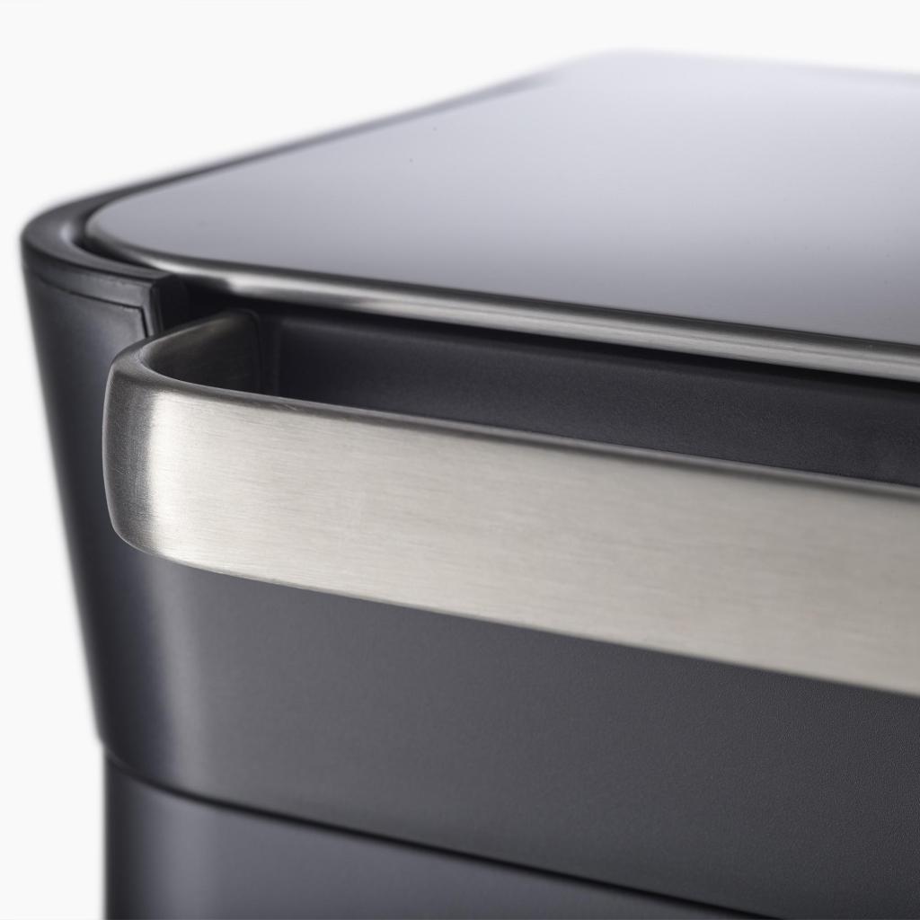 - Integrovaný kompresný mechanizmus umožňuje stlačiť odpad priamo vo vnútri koša, takže pojme až 3× viac odpadu než bežné koše podobnej veľkosti.