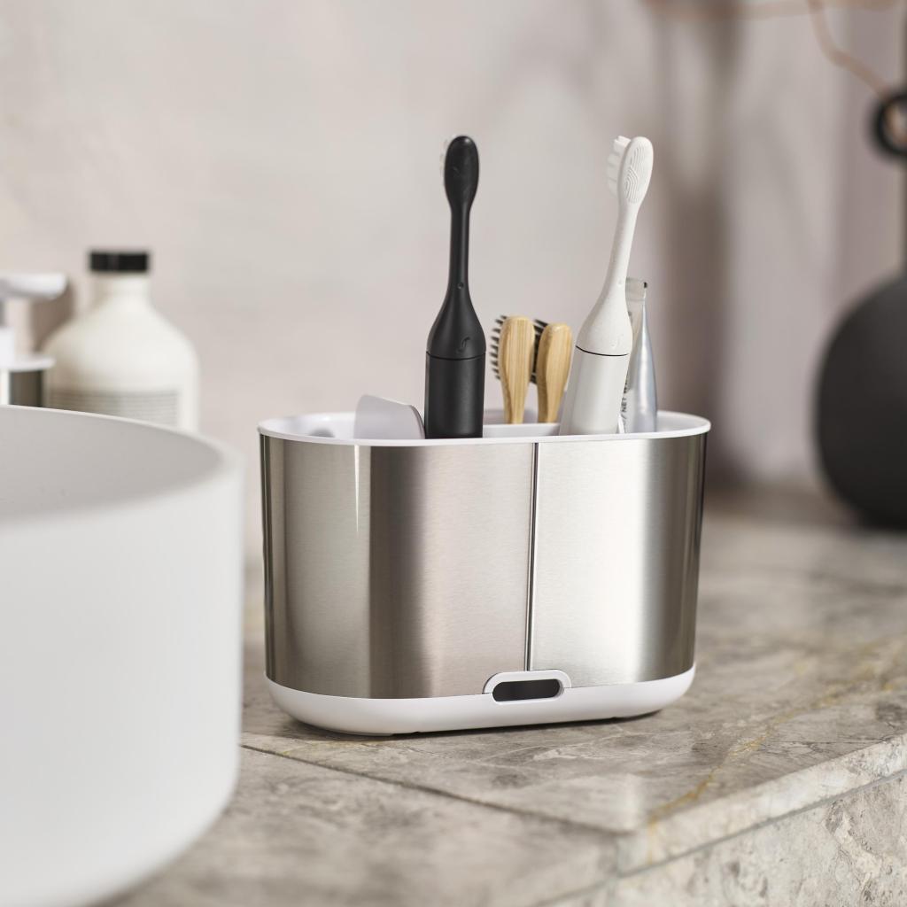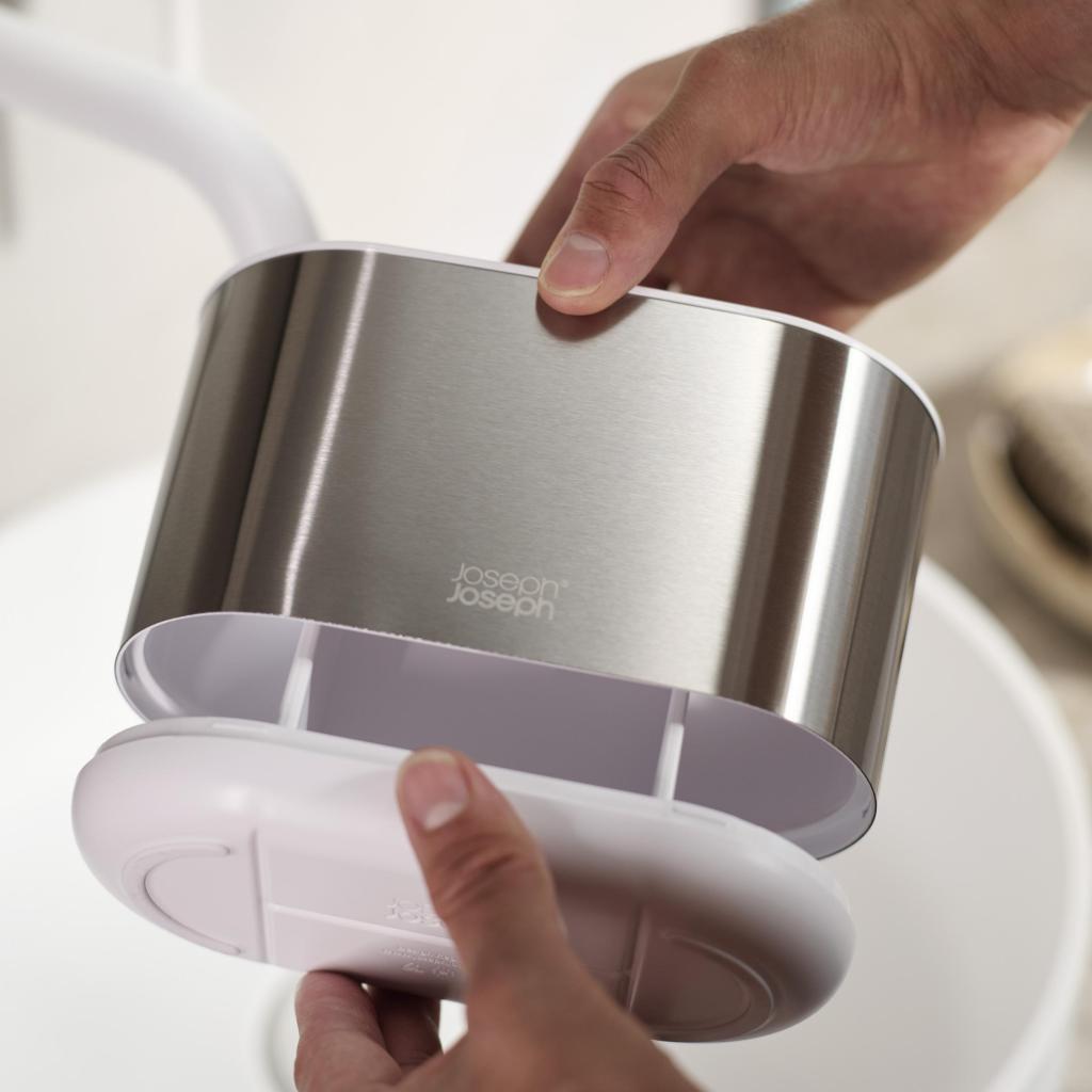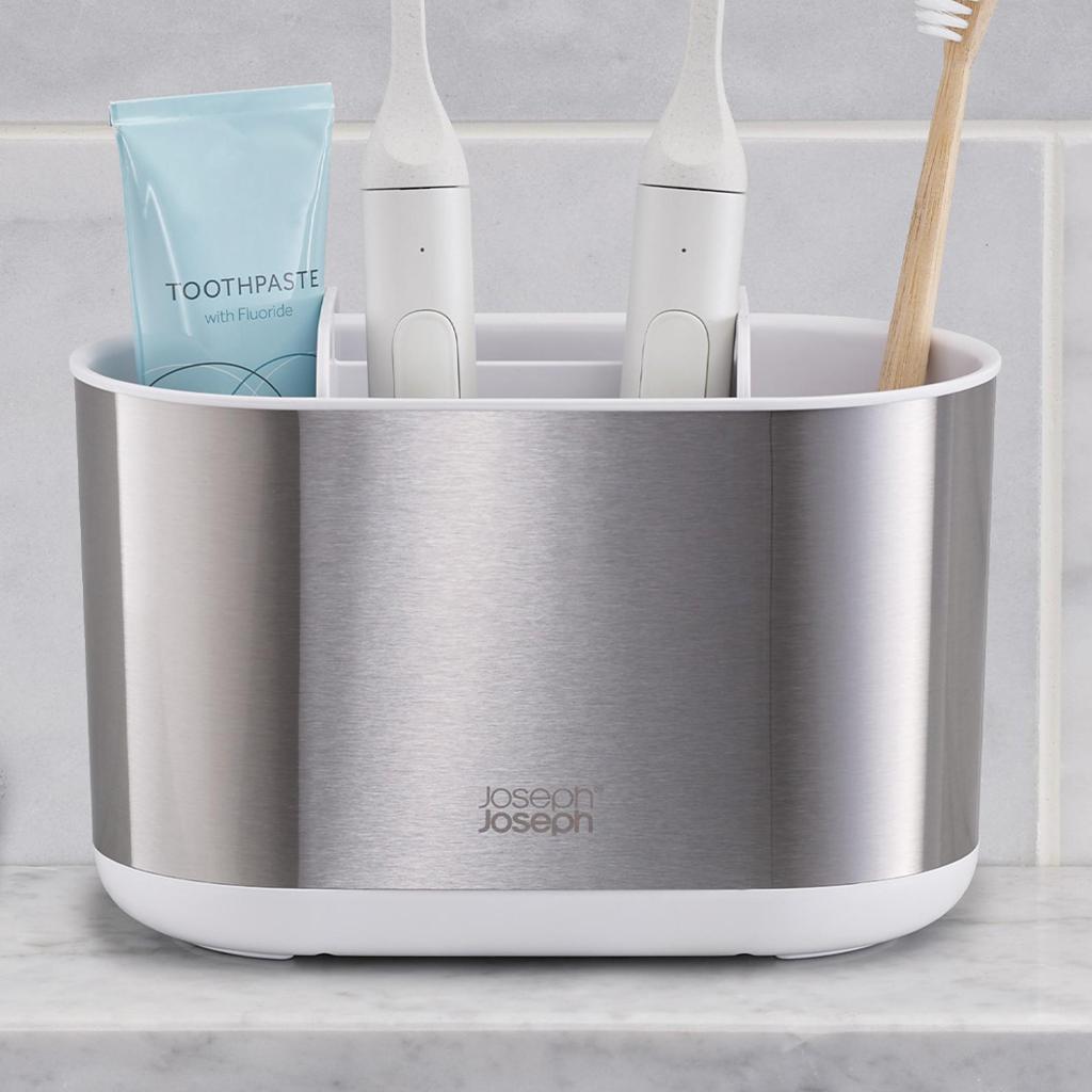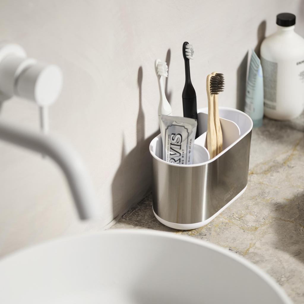 - Stojanček na kefky Joseph Joseph DUO STEEL ponúka veľkorysý a prehľadne členený priestor pre každodennú ústnu hygienu celej rodiny.