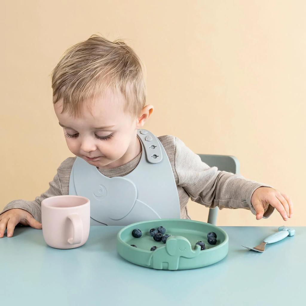 Podbradník pre batoľatá PEEKABOO ELPHEE , sada 2 ks, sivý, silikónový, Done by Deer