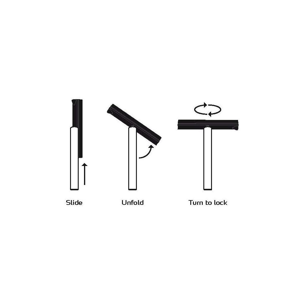 Skladací mechanizmus je jednoduchý: Plastová čepeľ škrabky je štandardne uložená v rukoväti z nehrdzavejúcej ocele. Keď budete chcieť škrabku použiť, uchopíte rukoväť a druhou rukou čepeľ škrabky vysuniete tak, aby bola kolmo na rukoväť. Potom otočíte rukoväťou proti smeru hodinových ručičiek, čím zaistíte čepeľ v správnej polohe.