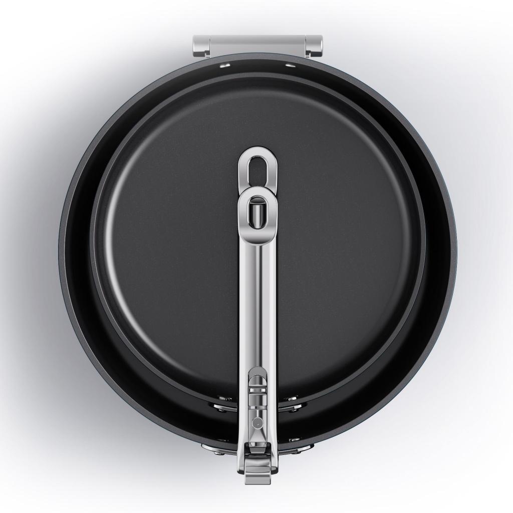 - Inovatívna konštrukcia umožňuje zloženie rukovätí, vďaka čomu ušetríte až 50 % priestoru oproti bežným panviciam pri skladovaní v zásuvkách alebo skrinkách.