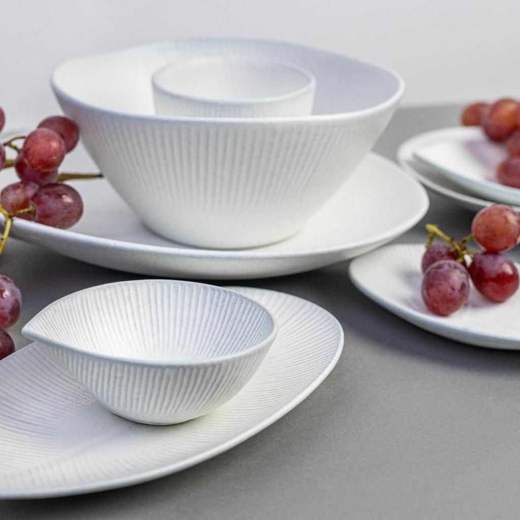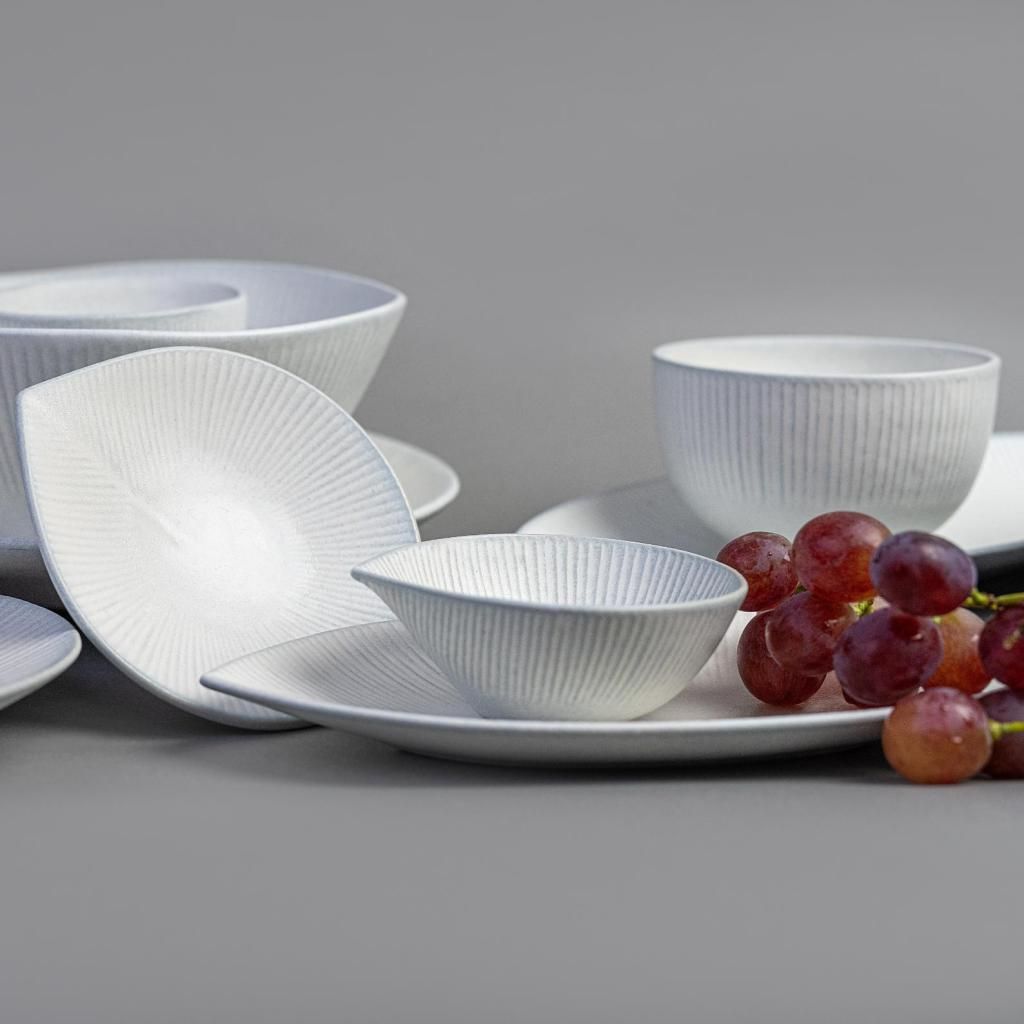 - Matne biela glazúra so svetelnými odleskami dodáva tanieru pokojnú atmosféru, ktorá ladí s modernou i prírodne ladenou výzdobou stola.
