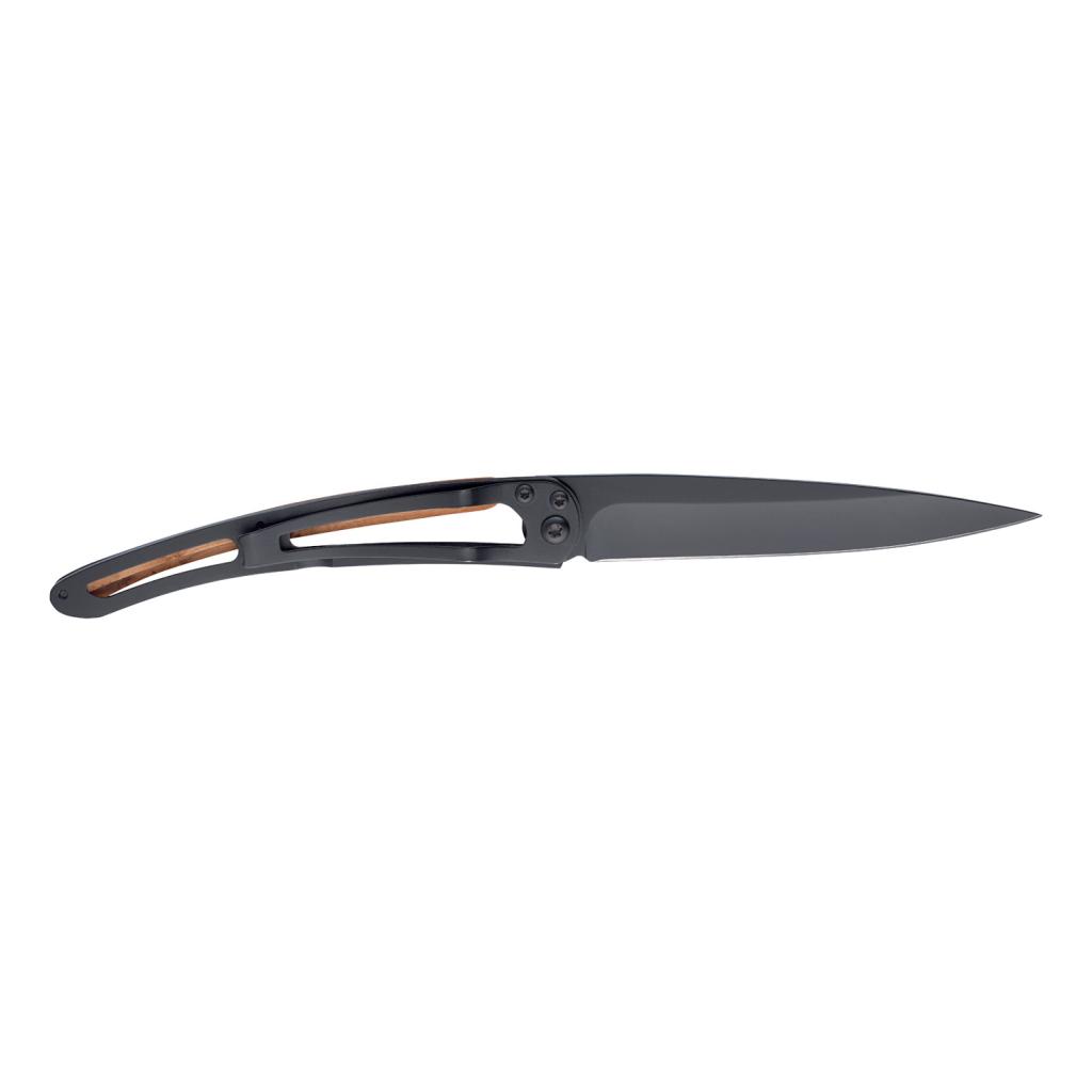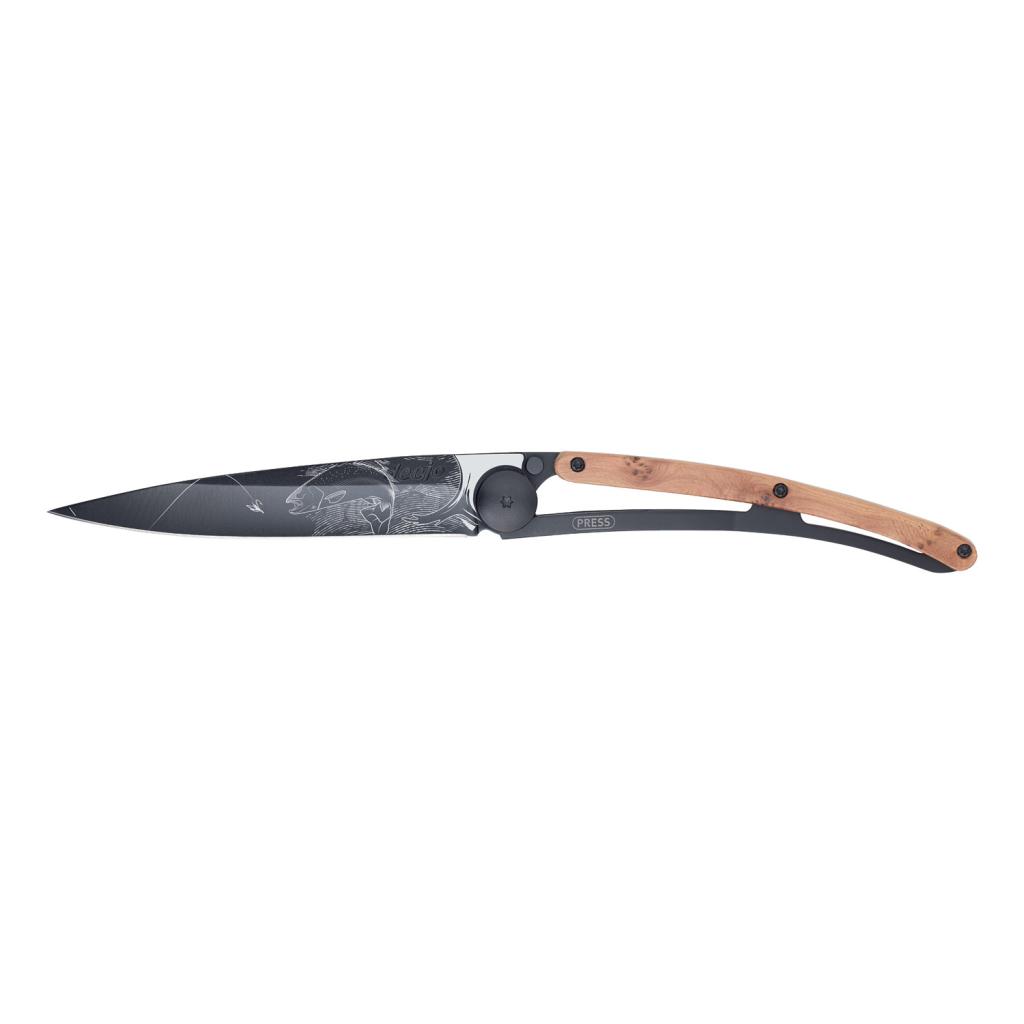 Ultraľahký vreckový nôž z ušľachtilej ocele s čiernym titánovým povrchom svetlým gravírovaním/tetovaním, je vybavený bezpečnostnou poistkou liner lock, ktorá zaisťuje bezpečnú manipuláciu aj uloženie noža. Laserové gravírovanie čepele je odolné rovnako ako tetovanie. Drevená črienka z koreňa odolného borievkového dreva je pevne usadená na rukoväti noža. Francúzska borievka má dlhotrvajúcu jemnú aromatickú vôňu jemného korenia, ktorá pridáva noži charizmu.